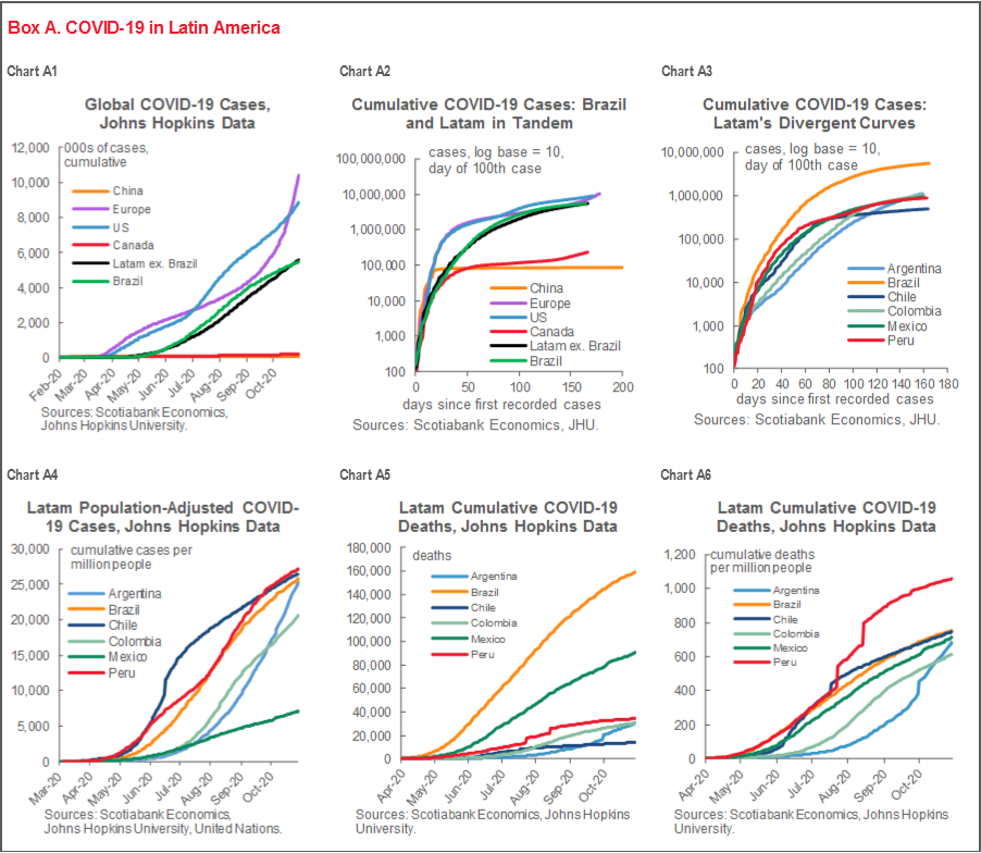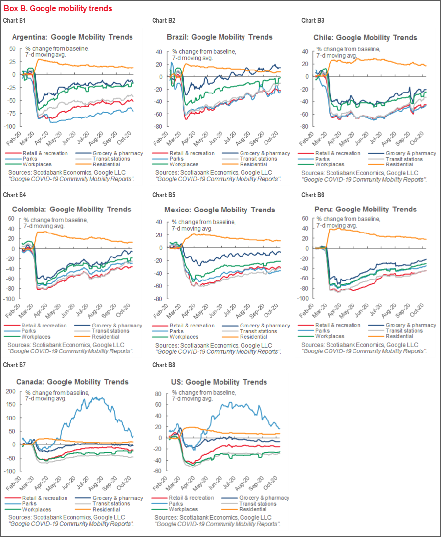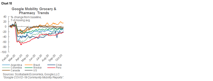 Mobility trends. According to Google mobility data, Latam transit usage to October 23 was down -31% compared with the region’s early-2020 averages (chart of the week, p. 1), better than Canada (off -46%) and only a shade weaker than the US (down -29%). Visits to grocery stores were, on average, down -9% in Latam versus the start of the year (chart 10), again only a bit softer than Canada (-3%) and the US (-7%). Brazil is the outlier, where spotty contagion control measures and loosened lockdowns mean grocery-store visits are up 15%. Detailed individual country mobility data are provided in box B for the Latam-6, plus Canada and the US. While Canadians and Americans have balanced more time at home with many more visits to parks (chart B7 and B8), a trend that has tapered off only as autumn has arrived, Latin American park visits are still down by an average of -40% compared with the beginning of the year. Perhaps this will change as summer arrives in the southern hemisphere, but it points to a possible unexploited avenue by which social cohesion could be enhanced if and as lockdowns are extended.