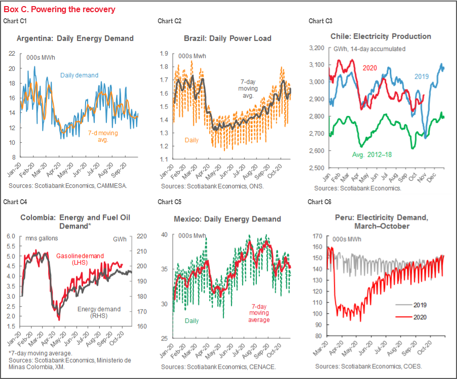 Power. Argentina energy demand was down only -1.4% y/y at end-September (Box C, chart C1). Brazil power demand was actually up 3.9% y/y in late-October (chart C2), while Mexican demand was down only -0.3% y/y (chart C5). Compared with early-2020, Colombia energy demand is down -5.2% (chart C4) and Peruvian demand is off about.-3.9% (chart C6). Chile’s year-on-year comparison is complicated by 2019’s social unrest, but power demand in late-October was 8% higher than in the 2012–18 average for the same month. See box C for detailed individual country charts.