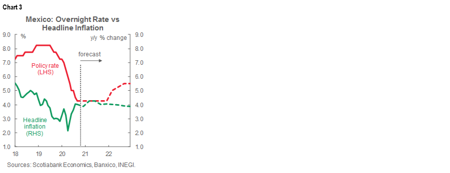 Mexico. The Banxico Board’s next monetary policy meeting is scheduled for Thursday, November 12 and it is expected to be another finely balanced decision. In a close call, our team in Mexico City expects the Board to hold the target rate at 4.25%, thereby ending its easing cycle (chart 3).