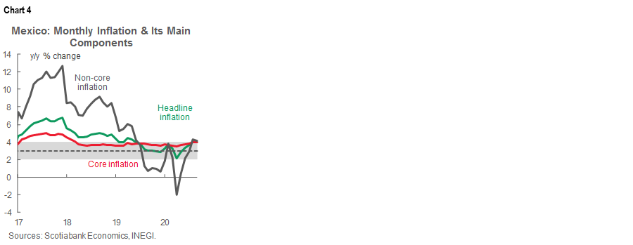 In the meeting’s minutes, published on October 8, we saw evidence of more varied views than was suggested by the Board’s unanimous vote. In fact, it appears that three of the Board’s five members noted at least some equivocations on the need for another cut in the reference rate. With inflation still above the 4% upper bound of Banxico’s target range (chart 4), we expect the Board to keep its benchmark policy rate unchanged at its November 12 meeting.
