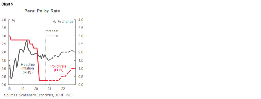 Peru. The BCRP’s Board is next scheduled to meet on monetary policy on Thursday, November 12, and along with what is likely to be a unanimous view amongst analysts, we expect the headline policy rate to be held at 0.25%, where it has been since early April (chart 5).
