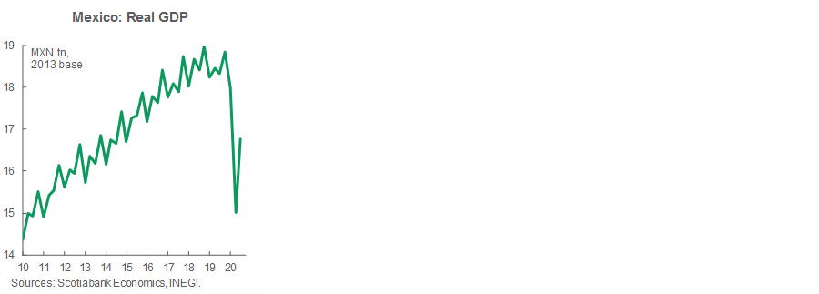 In the first advance, preliminary data on Q3, real GDP grew by 12.0% q/q as the economy recovered some of the ground lost due to the COVID-19 pandemic. This is good news, but it should be taken with the appropriate perspective. First, the rebound was naturally expected as economic activities reopened and—given the order of magnitude of growth rates—differences between expected and observed results should be taken with caution. Second, in Q3 the production level recovered only 40% of Q2’s losses and got back only to 2014 levels (chart). Third, there is a clear dichotomy in the pace of growth in the economy. On the one hand, manufacturing activities are presenting a fast rebound, pulled by external demand, mainly from US industrial activity, which is propelling Mexican exports. On the other hand, internal demand continues to show signs of weakness, as private consumption and investment have been affected not only by the pandemic, but also by a negative business environment due to controversial decisions on public policy. As a result, the services sector is recovering at a much slower pace of 8.6% q/q in Q3 versus 22.0% q/q in the industrial sector. In coming quarters, economic recovery in Mexico will depend on exports, which are performing well due to the US economic recovery—and on private consumption from households and investment from firms, both of which have presented weak readings. It is worth noting that a new confinement to contain the spread of COVID-19 is not being contemplated owing to concerns about the economy. If another lockdown proves necessary, then our forecasts will need another significant, negative adjustment.