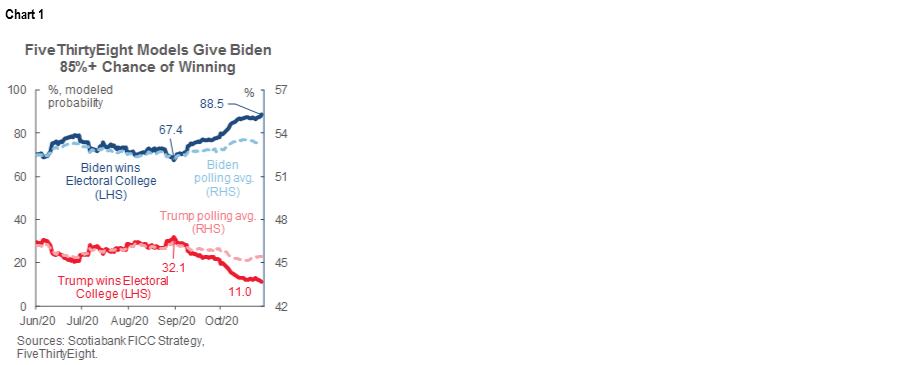 Price action in currency markets over the next week—and possibly beyond—will be heavily dependent on developments around the November 3 elections in the US. Barring declaration of a clear victory on election night (or soon thereafter) for either candidate, the USD looks set to maintain a better-bid tone. Election polls and models give former Vice-President Biden a clear lead over President Trump (chart 1), yet markets remain on edge owing to a possible repeat of former Sen. Clinton’s surprising defeat in 2016. In addition, the record-breaking number of early voters implies that there could be delays in vote counts that may mean a winner is not declared for weeks.