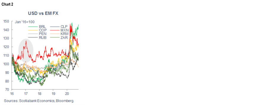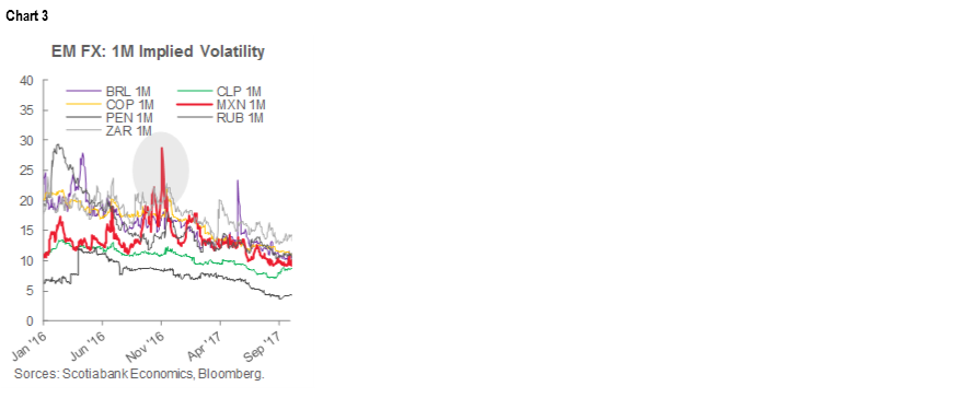 Markets, however, have a fresh memory of what happened to Mexican assets during and following the 2016 US elections, when the Mexican peso lost 30% from its highest level that year to the weakest point reached just after the US Presidential inauguration ceremony in January 2017. MXN was by far the worst performing EM currency during that period and has carried that additional risk premium persistently since then (chart 2). The spike in volatility seen in MXN going into and during the aftermath of the 2016 US elections also exceeded that of its peers (chart 3), which resulted in a decision by the Banco de Mexico to intervene directly in the market by selling USD spot and by participating in the NDF market for the first time in its history (see here for Banxico’s announcements).