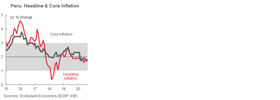 In the statement from its October 7 meeting, the Board’s main messages remained unchanged from previous meetings. It held to its commitment to maintain its expansive monetary stance for a “prolonged” period of time with a bias toward the implementation of greater stimulus, if it were to become necessary, through measures other than further cuts in the policy rate. That said, our team in Lima does not have the impression that the BCRP is preparing new instruments. Instead, the Bank is focused on providing liquidity through existing channels and managing PEN volatility, some of which is being driven by intermittent political strife between Congress and the Executive.