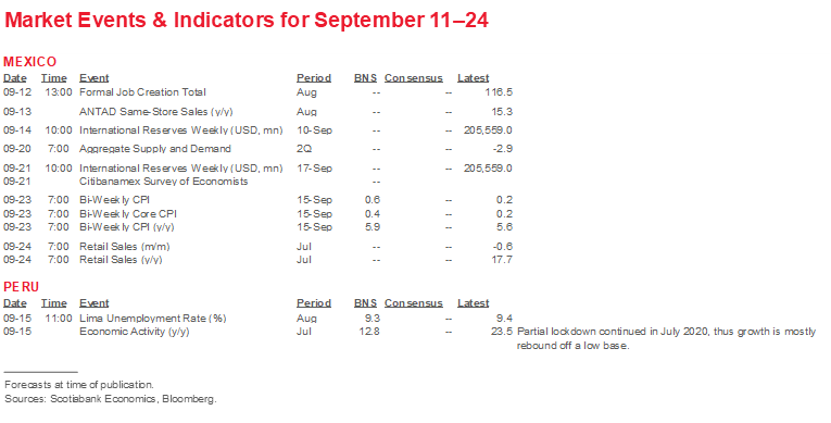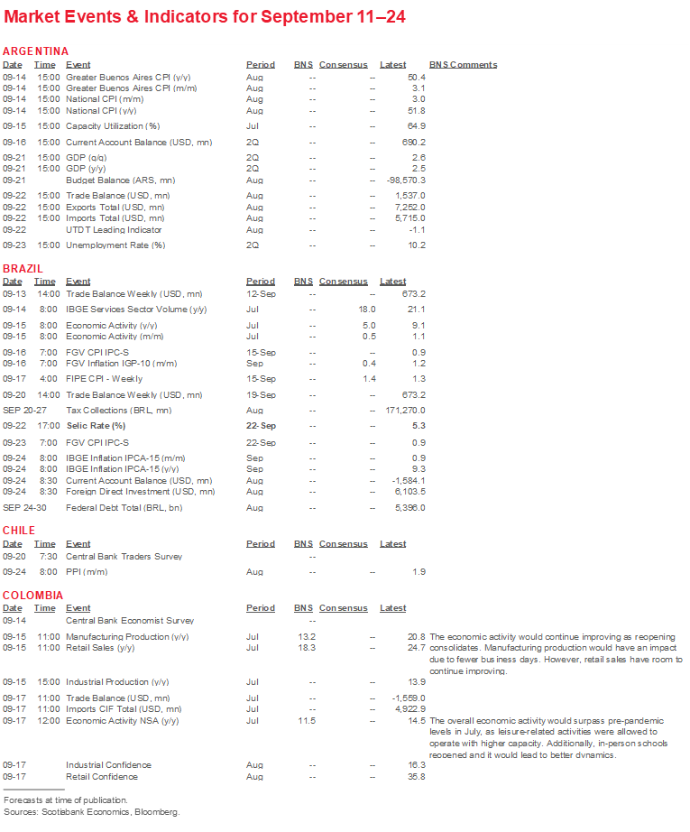 - A comprehensive risk calendar with selected highlights for the period September 11–24 across the Pacific Alliance countries, plus their regional neighbours Argentina and Brazil.