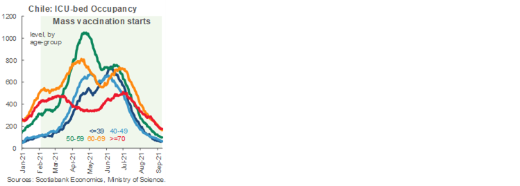 The number of confirmed COVID-19 cases per day has continued to decrease, falling to its lowest levels since April 2020. Similarly, the positivity rate is at the lowest level seen since the beginning of the pandemic and COVID-19-related deaths are decreasing. Vaccination reached 87% of the target population, while the occupancy of ICU beds continues to decrease in all age groups (first chart). Thanks to these developments, mobility has continued to increase, reaching—or surpassing for some activities—pre-pandemic levels. As of September 9, no commune is in lockdown, while more than 97% of the population has reached the highest degree of mobility in the “Paso a Paso” Plan.