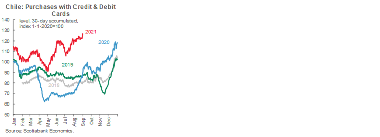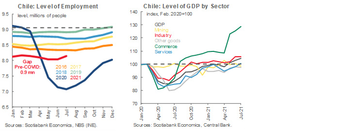 On August 31, the statistical agency, INE reported a drop in the unemployment rate to 8.9% in the quarter that ended in July, better than expected by the market (9.2%). Employment grew again (+108 thousand), after four consecutive months of falls or stagnation. Overall, the employment gap improved against pre-pandemic levels, narrowing to 914 thousand jobs (third chart), of which 476 thousand are formal jobs (52% of the total) and 439 thousand are informal. Moreover, on September 1, the BCCh released the July monthly activity index (Imacec), which expanded 18.1% y/y, in line with both market and Scotiabank expectations. According to the BCCh, only mining and construction sectors remain marginally below pre-COVID-19 GDP levels (fourth chart 4).