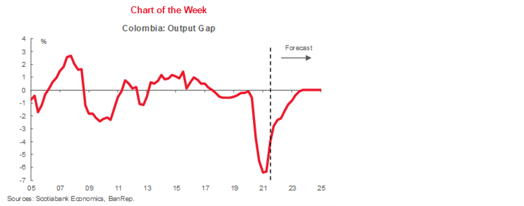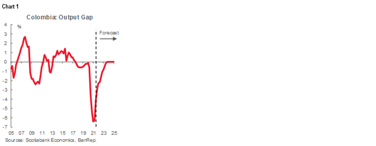 This outlook reflects several considerations. In this respect, among the shocks identified above, we think consolidation of the economic recovery and stronger demand next year are likely to have the most long lasting impact. Having said that, however, we anticipate that the normalization of food prices next year will reduce headline inflation by about 140 ppts. And while the resolution of global supply chain issues will not reduce prices, it would relieve further upward pressures on import goods, allowing base effects to play out in favour of lower annual inflation next year. Finally, the bias is that the COP will appreciate somewhat given stronger international demand and higher domestic investment fueled by FDI, which also helps headline inflation to return to the target range.