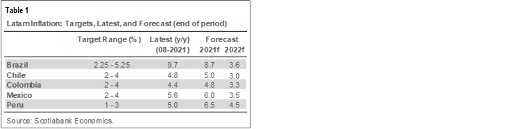 As noted in the recent update to Scotiabank’s Forecast Tables, supply chain constraints appear to be longer-lasting and more binding than previously assessed. These constraints are not only impairing short-term growth prospects in advanced countries, they represent a global inflation shock that could, potentially, test central bank price stability targets if not addressed in a timely fashion. Inflation has already surged across the Latam region.