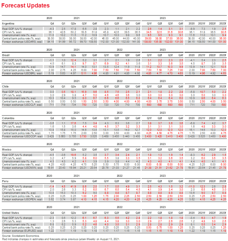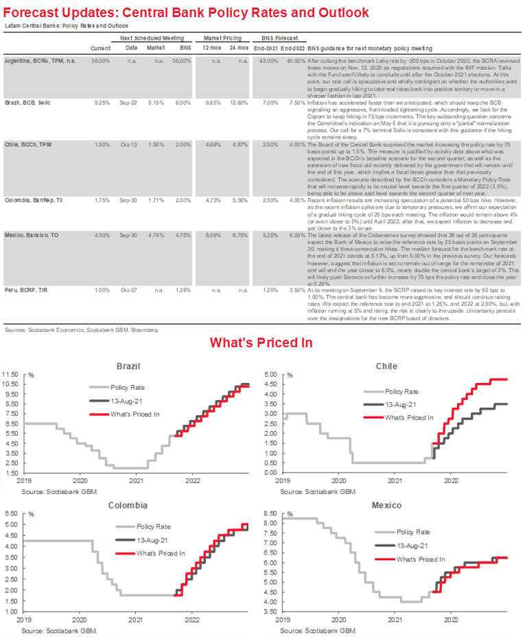 All of this has led our country teams to revise their policy rate forecasts. For Brazil, our team now anticipates the policy rate to hit 7.00% by end-2021, up from our June forecast of 5.75%. Smaller upward revisions have been made to the rate forecasts over the same horizon for Chile (100 bps), Mexico (100 bps) and Peru (75 bps). In Colombia, in contrast, our team in Bogota has pared down its forecast of year-end inflation by 100 bps owing to country-specific factors that could contain price pressures there. In all cases, however, rates move higher relative to current levels. The overarching message is clear: higher inflation means higher rates.