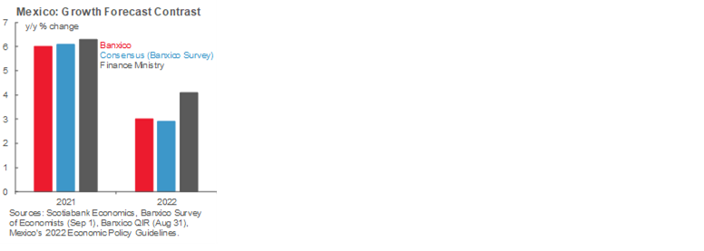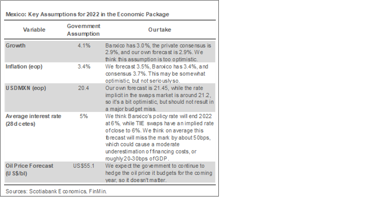 On the policy front, new Finance Minister Rogelio Ramirez de la O presented his first economic package, including the budget and revenues law for 2022. Implementation of the package is a three-stage process. First, the Economic Policy Guidelines must be ratified by the Legislative, setting the assumption framework under which the package is supported (table 1). Second, the Revenues Law (including the debt ceiling) will follow and requires ratification by a 50% + 1 majority in both houses. Third, approval of the Expenditure Decree, which only needs ratification (also a 50% +1 majority) by the Lower House by the November 15 deadline. Morena’s coalition has the necessary votes in both houses, and we don’t anticipate major changes to the package.