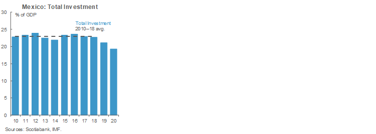 - The government’s 2022 budget is based on a growth assumption of 4.1% for the year. This contrasts with the 2.9% consensus among private economists, and the 3.0% anticipated by Banxico. As we wrote last week, we believe that new Finance Minister Ramirez de la O sees himself playing the role that Alfonso Romo (former Presidential Chief of Staff and liaison to the private sector) held as liaison between the government and the private sector, seeking to boost investment by instilling confidence. In an interview released on September 9, the Finance Minister is said to have pointed towards a recovery in private investment as the anchor that will support the government’s much more optimistic growth projection for 2022. The 4.1% growth estimate is explicitly premised on the assumption that the government will succeed in boosting confidence. To some degree, we do agree that investment should pick up somewhat in 2022—not necessarily because firms will seek to expand (which requires a recovery in private sector confidence), but because after two years of deep contractions, which has seen investment to GDP drop by almost 20% of its pre-2019 level, companies will have to invest simply to keep market share in an economy with a growing population (first chart).