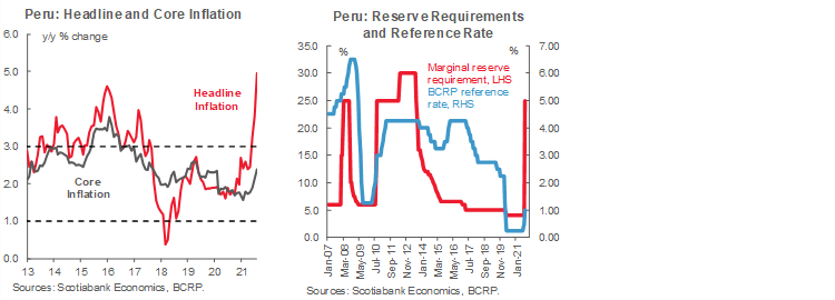 Most Latam central banks have responded to higher inflation. The central banks of Brazil, Chile, Mexico and Peru have all moved to raise key policy rates; our team in Colombia expects BanRep to follow suit at its next policy meeting, scheduled for September 30. In Peru, the BCRP coupled rate hikes with a steep increase in reserve requirements, which our experts in Lima point out is not without precedent (see discussion below).