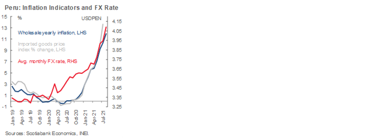The reality of inflation has changed swiftly in the country. Earlier this week we raised our inflation forecast to 6.5% for 2021, from 3.5%, and to 4.5% for 2022, from 3.0%. These are hefty changes. The pass-through from higher import prices (especially energy, and soft commodities such as wheat and maize), higher freight, containers and other transportation costs, and a rising FX rate, has still to be felt fully in headline inflation (third chart). Wholesale price inflation, soaring at 12% yearly, is telling in this regard. A year ago, wholesale inflation was negligible at 0.1%. Domestic political and policy uncertainty is also spurring volatility, with the risk that the PEN depreciation of recent months could generate a feedback loop with inflation. The BCRP needs to disrupt this loop quickly, which is why it is acting more aggressively, despite an economy that is still trying to get back on its feet after the 2020 COVID-19 lockdown.