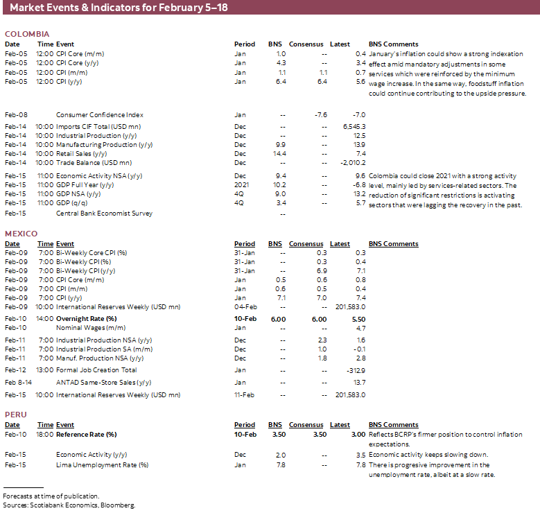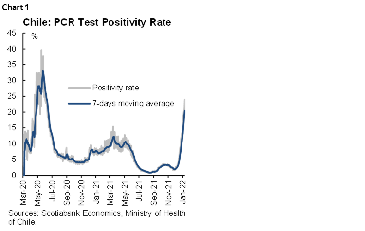 In the political arena, on Wednesday January 26, Congress passed the bill creating the Universal Guaranteed Pension (PGU) and its financing. The initiative will provide a contribution of up to CLP 185,000 (USD 231) on an annual basis for all those over 65 who are in the 90% of the lowest income brackets, whether they are retired or not, benefiting 2.2 million people. According to government estimates, the first stage of benefit payments will begin in the third week of February, targeting around 1.5 million people. According to Scotiabank estimates, the PGU could contribute around 0.2–0.3 percentage points of additional GDP growth in 2022 owing to the positive impact that will have on the private consumption.