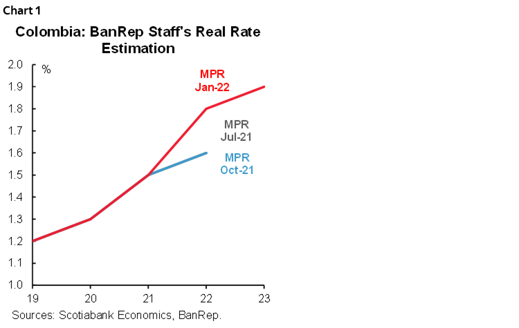As Scotiabank’s team in Colombia argue in the country update section below, BanRep has conducted such an assessment and has adjusted policy accordingly. Our economists in Bogota note that a decomposition of three critical factors behind the calibration of policy rates points to the need for the central bank’s accelerated pace of rate hikes, which kicked off with a gradual 25 bps increase. The pace of tightening picked up, however, as the estimated neutral real rate—the real interest rate required to keep inflation on target and stabilize output around potential—was raised, inflation expectations rose, and the potential output gap (the difference between actual and potential output) narrowed more quickly than previously expected.