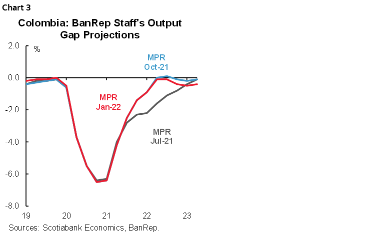 iii) Third, the output gap. Initially, the output gap was the main reason BanRep started the normalization process with a conventional 25 bps pace in September. In July of last year, for example, the central bank expected an output gap of -2.3% in 2021 which narrowed relatively quickly in 2022 to -0.8% (chart 3). By October, however, BanRep staff realized that the economy was growing faster and reduced the negative output gap estimate to -1.4% for 2021 and -0.1% for 2022. Interestingly, the relaxation of mobility restrictions did not produce major changes in the output gap estimates. In fact, in January’s inflation report, staff estimated that in 2021 the output gap remained at -1.4%, and that 2022 will be -0.4%. These projections imply that the economy is no longer in need of monetary stimulus since the pace of recovery could increase as employment returns to pre-pandemic levels.