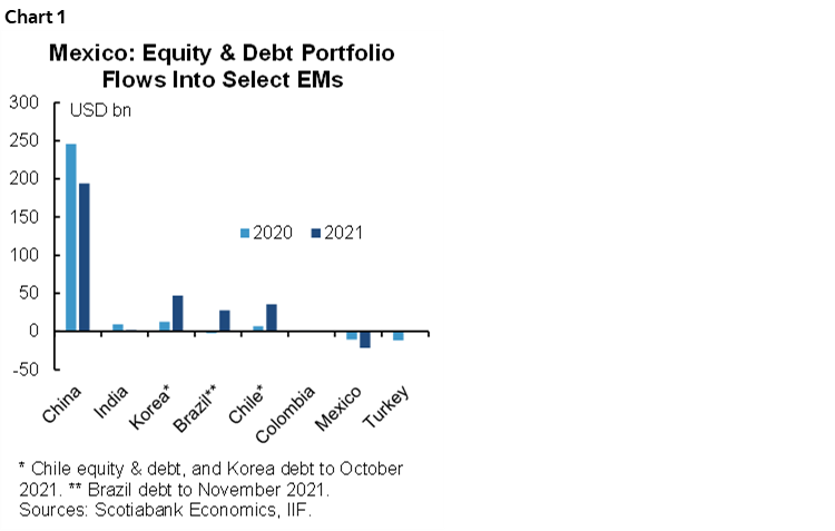 Moreover, recent actions and signals sent by regional central banks could also prompt Banxico to once again hike rates by 50 bps, to help anchor domestic capital markets. It is notable that so far in 2022, four of the six top-performing currencies among the most liquid 32 are in Latam (BRL +7.6%, CLP +4.96%, COP +3.3% and PEN +2.8%), while MXN is in negative territory YTD (-0.2%). Chile, Colombia, and Brazil have all seen triple-digit rate hikes in their latest central bank decisions—even if they did start the cycle with much looser settings. Part of MXN’s underperformance could reflect a catch-up effect, but current negative real policy rates (-150 bps) and an economy in technical recession are likely not helping. According to the IIF’s portfolio flows data, Mexico is one of the rare EMs where portfolio flows were negative in both 2020 and 2021, and which also saw an acceleration of outflows into 2022 (chart 1). Over the past two years, Mexico’s debt and equity markets lost around USD30 bn in foreign portfolio flows.