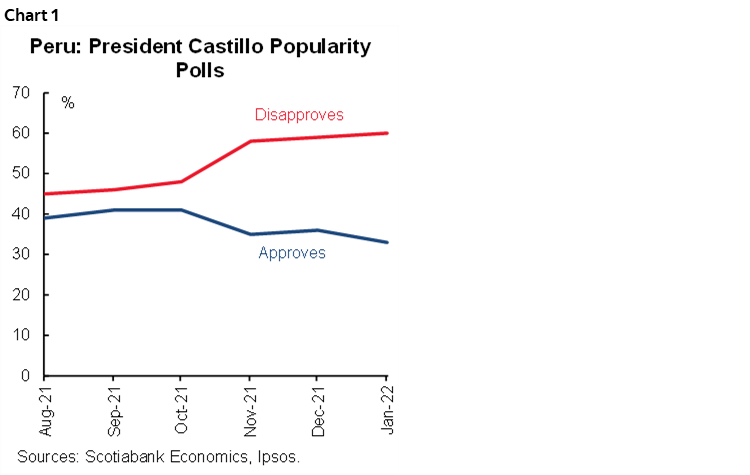 2022 begins with a new episode of political tension that has led to the appointment of a new Cabinet, the third in six months. The previous Cabinet chaired by Mirtha Vasquez lasted only four months, from October 2021 to January 2022. Though it had a moderate profile in general, it did not resolve underlying problems, so the president’s disapproval rating was increasing (64% in January according to an IEP survey). Meanwhile, the change of Cabinet reflects that the frictions within the government continue. The appointment of the Cabinet chaired by Hector Valer has been criticized for supporting the Constituent Assembly, the inclusion of inexperienced ministers, and police complaints regarding some of its members, and for what is perceived as a step backwards in government management. The signal from the Valer Cabinet is that the frictions with Congress, and therefore the political uncertainty, will continue. This leaves us with the feeling that the country is adjusting to a situation of lasting political discomfort. President Castillo’s popularity has been weakening during the first six months of government, reaching a level of disapproval of 62% in January according to an IEP survey (chart 1).