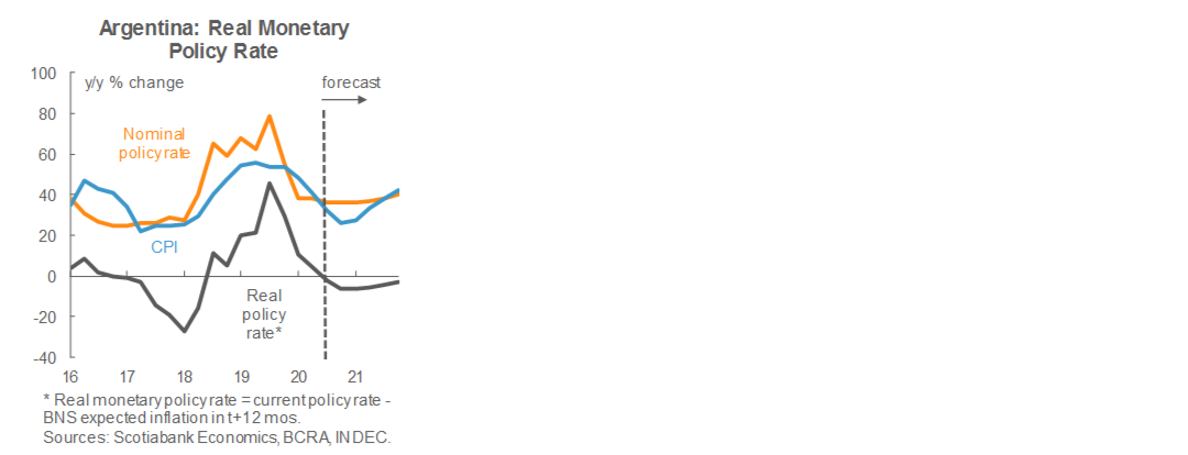 With its fourth set of proposed debt restructuring terms that were delivered on July 5 June inflation numbers come out on Wednesday, July 15. Official inflation readings continue to be artificially suppressed by (1) capital controls that are propping up the official value of the ARS and (2) domestic price controls on the utility sector along with official monitoring of thousands of additional items to discourage price increases. As a result, our inflation outlook is grounded more in a political view that these measures will remain in place late into 2020 rather than a clean reflection of fundamental macroeconomic dynamics. We expect June to record a third month in a row with headline inflation held around 1.5% m/m, which would bring annual inflation down to around 42% y/y owing to base effects from last year’s spike in prices. We expect the authorities to loosen FX controls in the autumn and allow prices to begin to move slightly more freely, which would see month-on-month inflation rise to around 2% even as base effects bring annual inflation down to a temporary low at 25.7% y/y by end-2020, its lowest rate since April 2018. Even with artificially low official inflation numbers, real monetary policy rates have moved back into negative territory and are set to stay there over our forecast horizon (chart); and