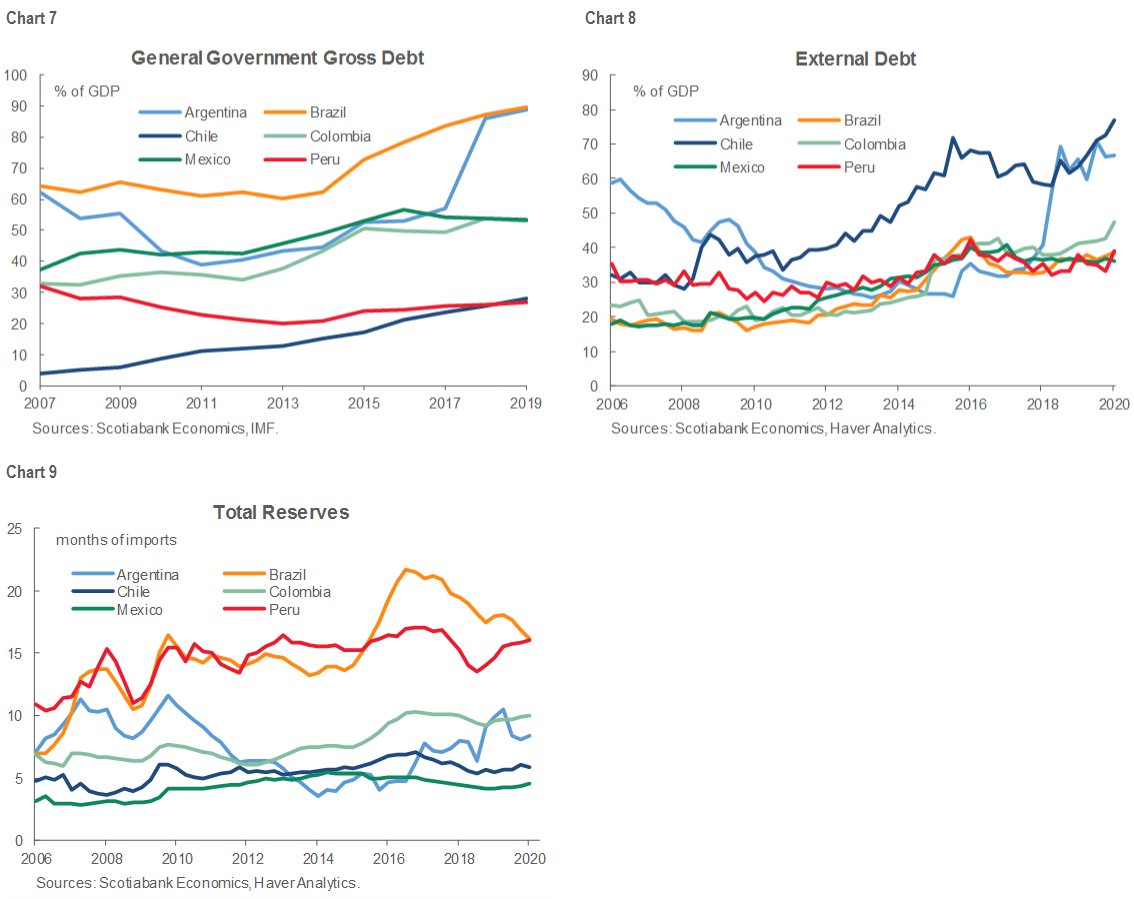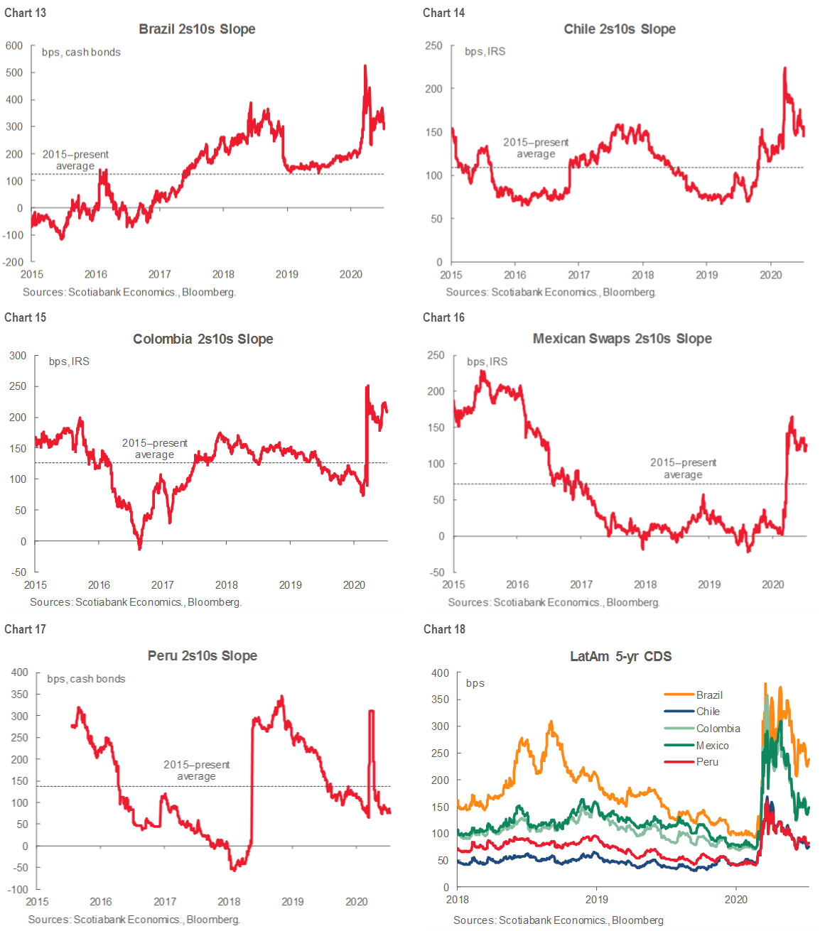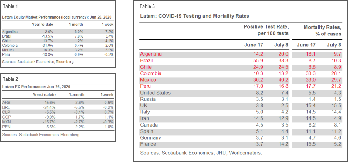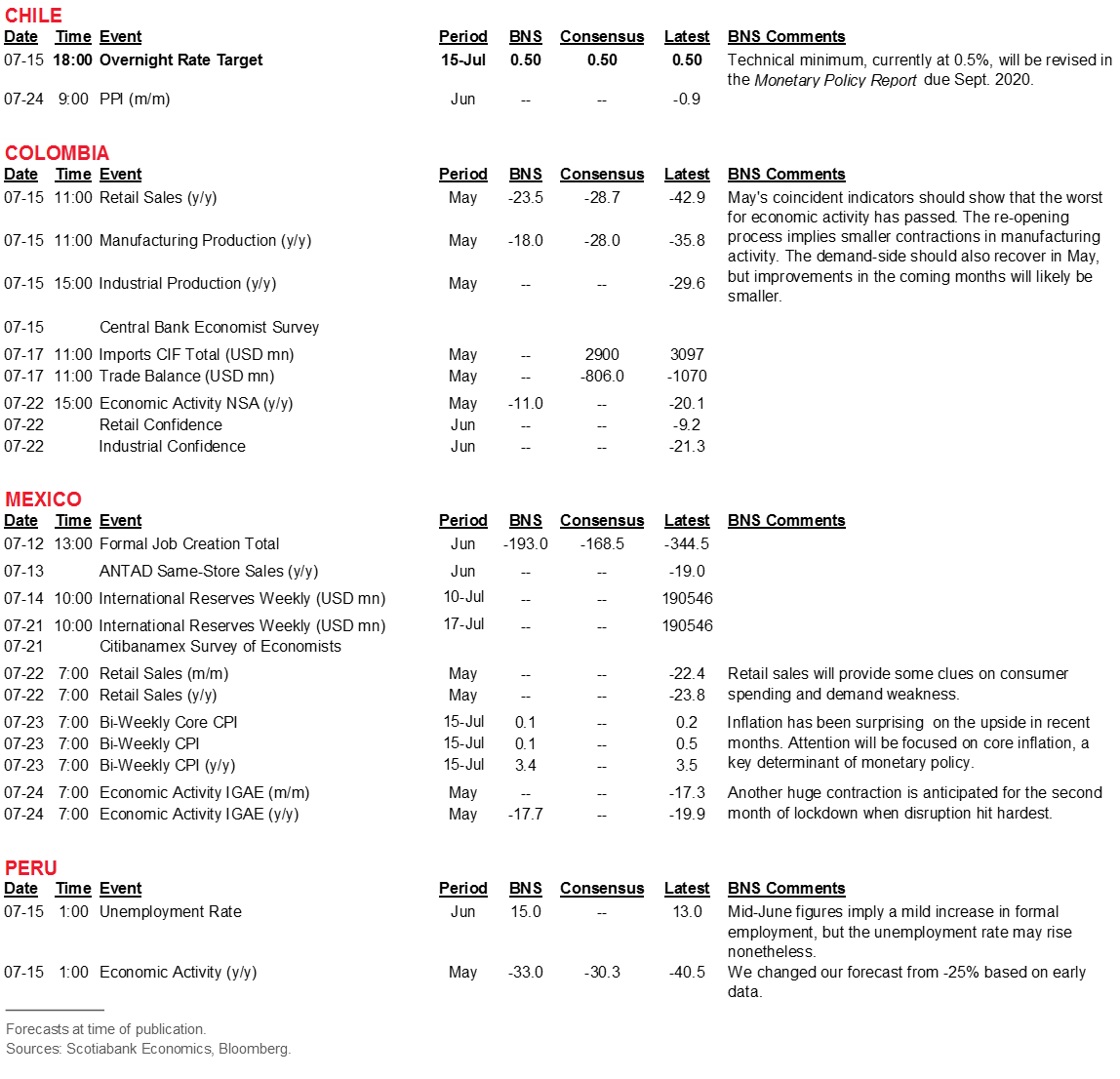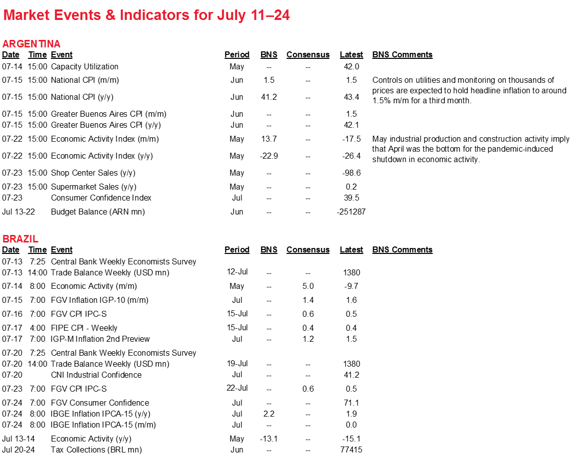 In major data prints, May economic activity index readings are due in Brazil (July 14), Peru (July 15), and Argentina (July 22). They will likely confirm the beginning of rebounds from the worst of the COVID-19-induced shutdowns in April, but will also point to long recoveries ahead.