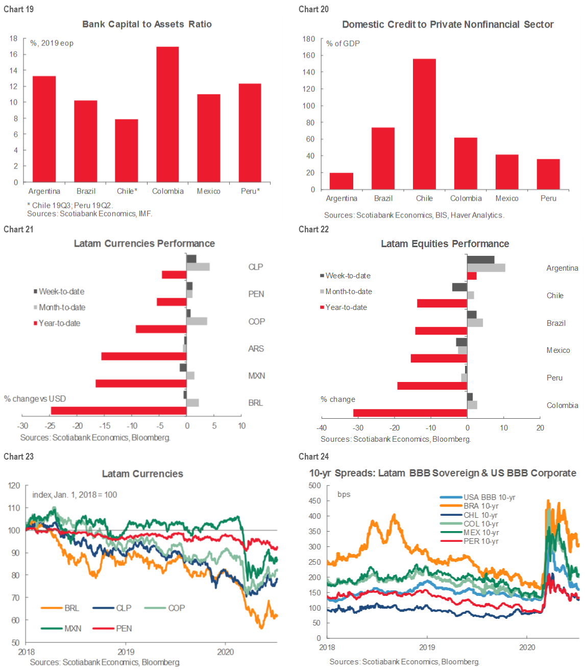 The depth and breadth of the ongoing COVID-19 pandemic in Brazil, the uneven policy response, and recent data have prompted a major overhaul of our forecasts, which now feature lower growth, weaker inflation, and higher unemployment. Softer inflation in Colombia and the latest communications from the BanRep have moved our team in Bogota to cut its forecast for the terminal monetary policy rate by -50 bps from 2.50% to 2.00%. Growth in Mexico is now expected to be a touch weaker in 2020, followed by a stronger rebound in 2021.