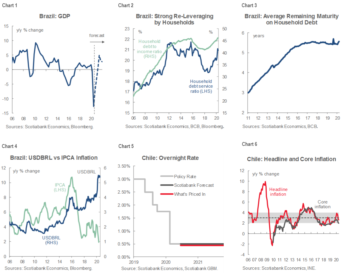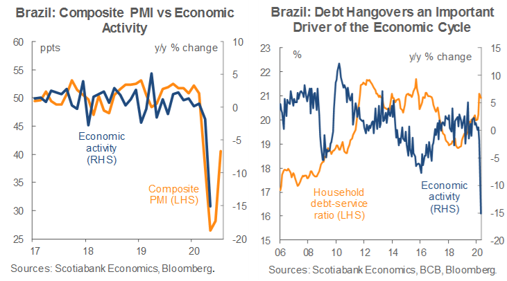 Our revised forecasts for weaker Brazilian growth are still a bit more optimistic than consensus for 2020, but less constructive for 2021. Our flatter growth pattern is to a large degree based on the recent “upward surprises” we have had with respect to Brazilian PMIs. In addition, we think the loosely enforced lockdowns the Brazilian government has implemented will mean some sporadic boosts to activity, but a longer pandemic, and a more lackluster recovery in 2021. We see two factors weighing on growth next year: (1) a consumer debt hangover; and (2) shaken confidence due to political uncertainty, which would present significant headwinds for investment. Rising rates could also suppress next year’s bounce. The combination of these factors explains our flatter-than-consensus anticipated rebound in 2021.