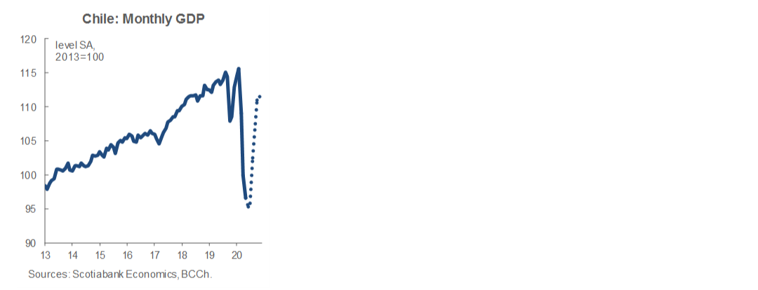 On Monday, Gran Santiago area will enter its ninth consecutive week in total confinement, as re-opening measures start to gradually materialize in very specific areas in the south of Chile, where there has been improvement in COVID-19 caseloads. With no tier-1 indicators coming out in the next two weeks, we will continue monitoring the discussion of the pension bill in Congress, as well as high-frequency indicators.