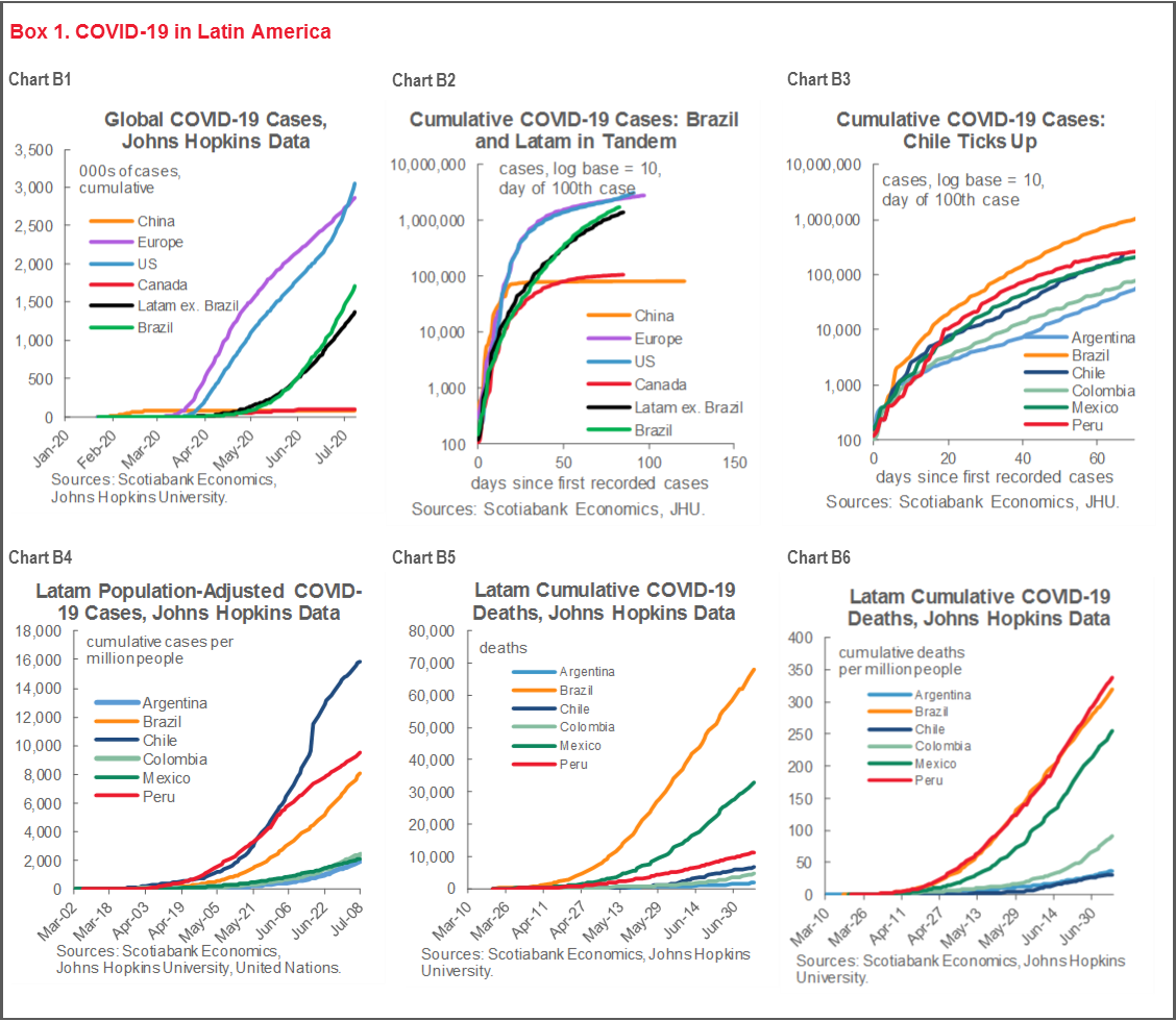 At the country level, new COVID-19 case numbers continue to make notable rises in Argentina and Chile. This past week Argentina recorded its first instance of more than 3k new cases in a single day. Both countries have intensified and extended lockdown measures in their capital regions until at least mid-July, with a strong likelihood that the expiry dates on these measures will be pushed out even further. That said, both countries also continue to ease restrictions in more remote regions where new case numbers are much lower. Our standard panel of COVID-19 charts in box 1 at the end of this section underscores that Brazil’s curve remains relatively steep compared with that for the rest of Latam, and that both Argentina and Chile have fared relatively poorly in recent weeks.