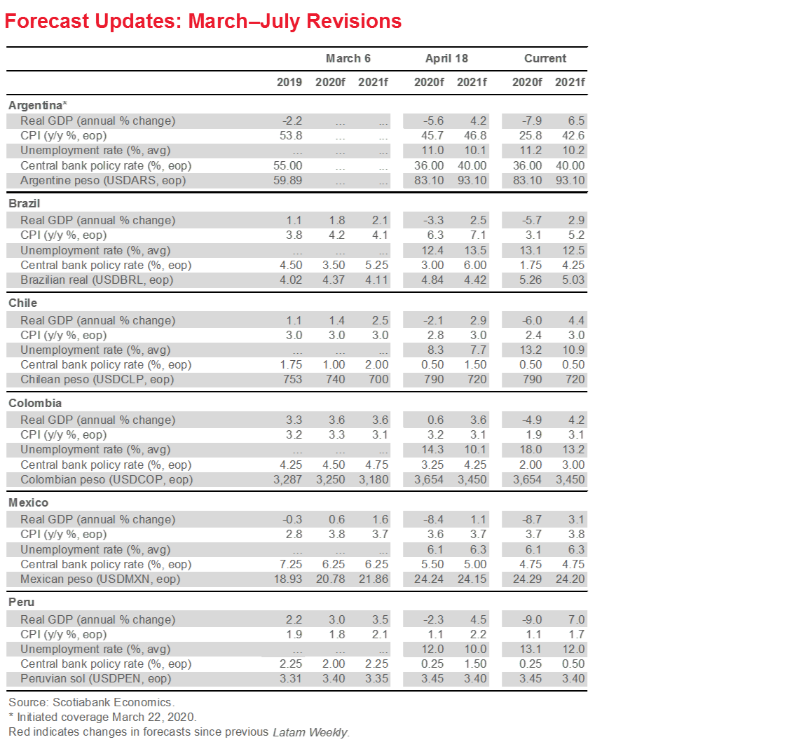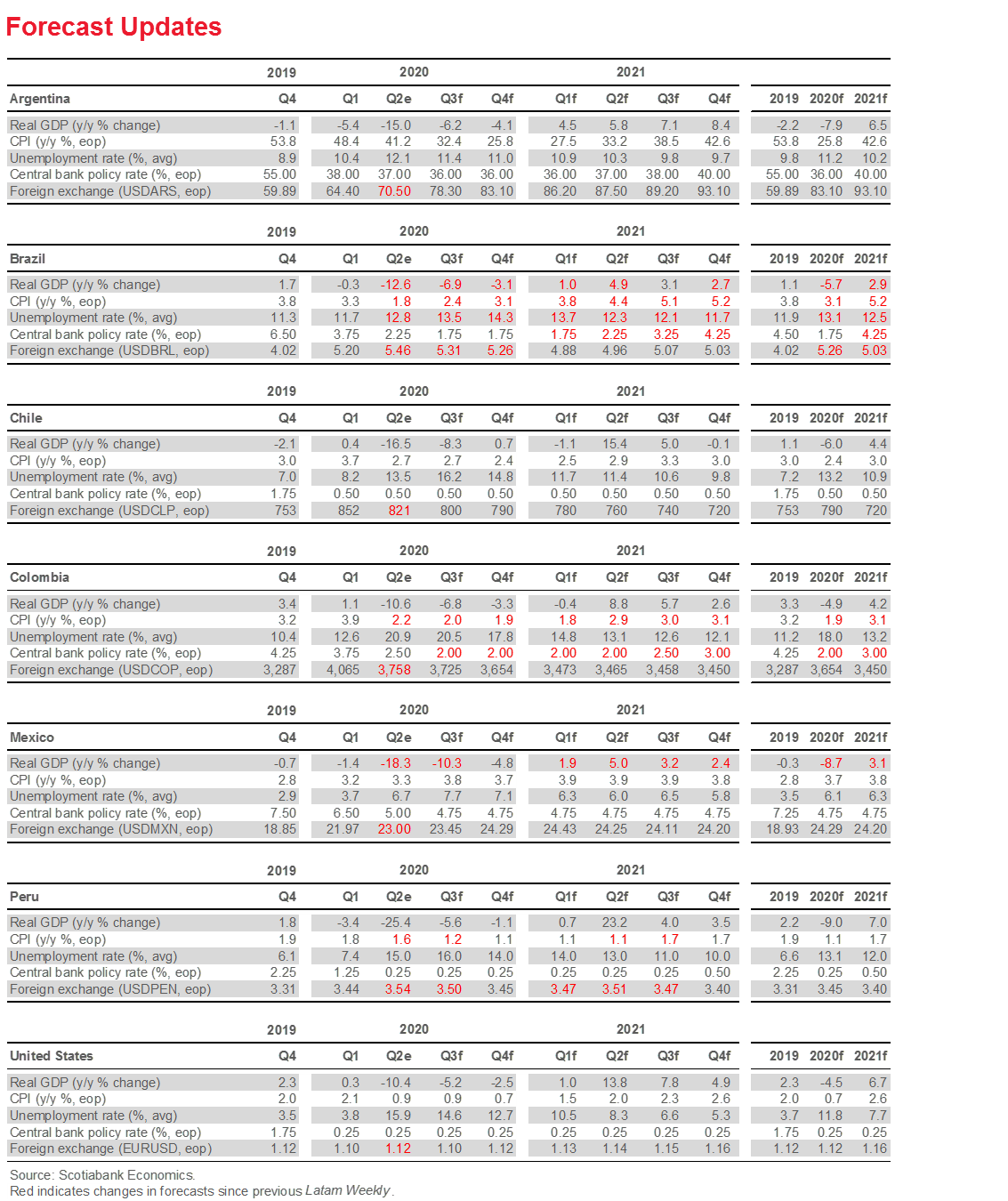 Although an accumulating set of data imply that the peak of lockdown measures in April was also the bottom for economic activity, our country teams continue to incorporate a bit more softness into their forecasts for the Latam-6 economies in 2020 (see Forecast Tables, pp. 2 and 3).