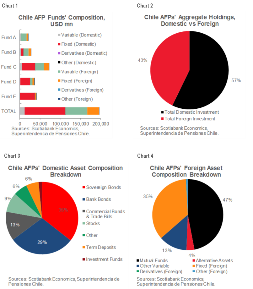 The AFPs in Chile own about 75% of Chile’s local government debt, and 6% of local equities. The broad composition of their portfolios is in charts 1–4 and further detail is provided in table1.