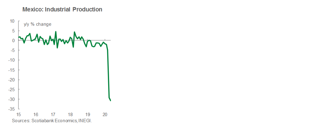 The second half of a complicated year is starting, and the Mexican economy, as well as many others around the world, is in a delicate situation. COVID-19 contagion keeps not only rising, but even accelerating in the world, and the ugly possibility of new isolation measures or a longer period of restricted economic activity is increasing. If this is the case, then the contraction of economic activity in Mexico will be even deeper than we currently forecast. Recent economic indicators have presented unprecedented and dramatic readings that depict the magnitude of the disruption produced by the pandemic. Real private domestic consumption fell -22.3% y/y in April, the deepest contraction on record for the main aggregate demand component. Total investment plummeted -36.9% y/y in real terms in the same month, also an unwanted record. Auto industry figures for the month of June were released and show that activity is resuming, but remains far away from previous levels: domestic sales contracted -41.1% y/y, production was -29.3% lower than a year ago, and exports fell -38.8% y/y. To have a better idea of where we are on the path to recovery, domestic sales were 60% of the average level registered in January–February; production was 74%, and exports were 79%, so there is still a good stretch to cover.
