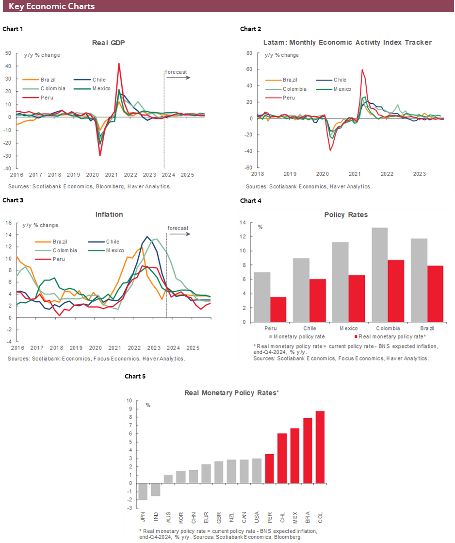 Data-wise, Mexico’s release calendar is the busiest of all, with retail sales, economic activity (IGAE), H1-Dec CPI, international trade, and the bi-weekly Citibanamex survey of economists all on tap. We’ll of course focus on the inflation data after Banxico’s upward revision to its forecasts for prices growth that suggests the bank may take its time with rate cuts—when they come. The INEGI’s advance indicator of economic activity points to a 2.86% y/y rise, slowing from the 3.34% IGAE print for September to its slowest since April.