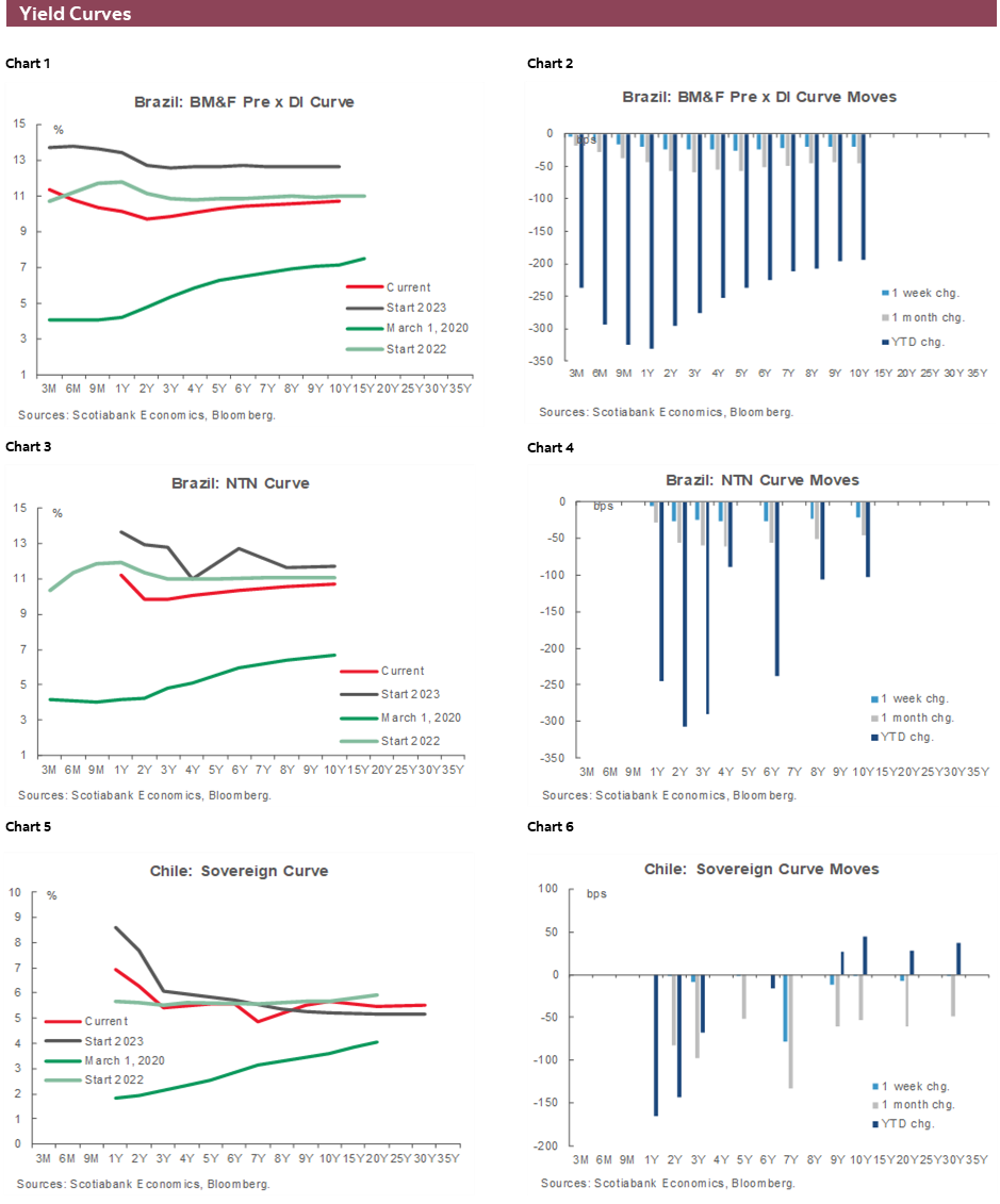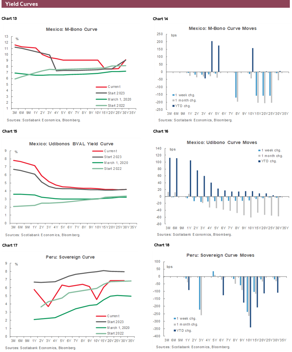 Since last Thursday/Friday, Latam currencies have been mixed. Some have followed the risk-positive and dollar-negative mood (MXN, COP, and CLP) but their performance significantly lagged that of G10 FX that were perhaps more responsive to the slide in US yields. On the other side, the PEN, down slightly 0.2/3%, is in an exclusive club of four currencies that weakened this week, joined by the MYR (-0.1%), the TRY (down -0.3%), and only doing a bit better than the official ARS drop of ~55% (by policy, of course).