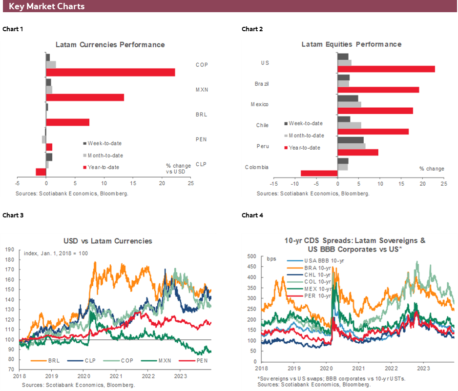 Elsewhere in the region, Brazil publishes October economic activity figures that are expected to show flat growth alike in September, Chilean November PPI and Colombian industrial/retail confidence and imports/trade balance should be an afterthought for markets. We also get the BCB’s Quarterly Inflation Report but don’t hold your breath for much that could alter the clearly laid out path of 50bps cuts at the next few meetings; minutes to the decision out on Tuesday may be more informative. BanRep’s meeting minutes out on Friday will be worth a look to gauge the bank’s next steps. In the G10, US, Canada, UK, and Japan inflation data, the BoJ’s announcement, and the last central banker appearances of 2023 will also keep us busy.