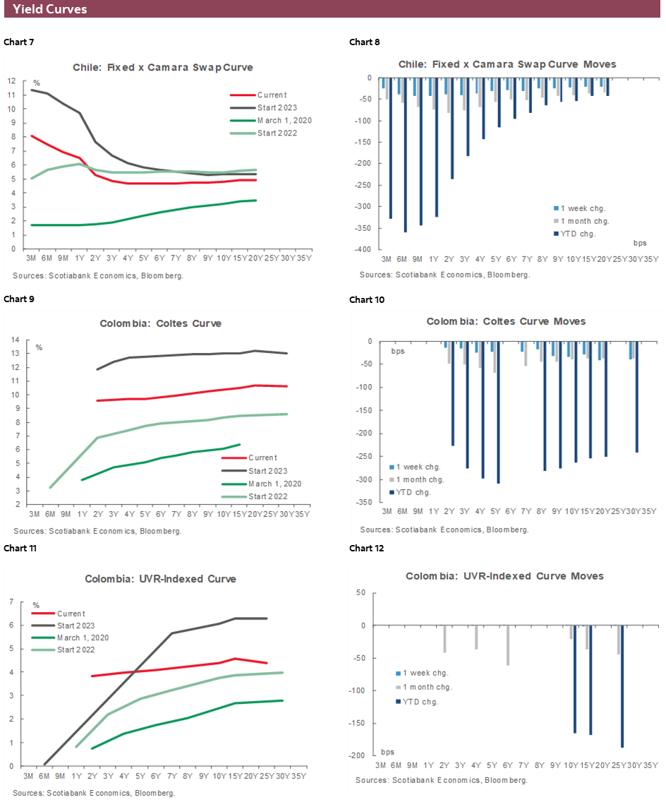 - Next week’s BanRep and BCCh decisions are not done deals. BanRep looks like a toss-up and there’s a small chance that the BCCh could deliver a 75bps cut and not the 50bps we expect. Another large unknown for Chile’s markets will be the results of Sunday’s vote on a new constitution. In today’s weekly our teams in Bogota and Santiago preview BanRep, the BCCh, and the possible implications of the referendum.