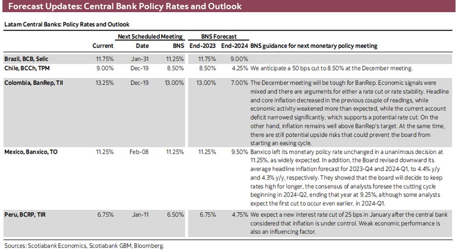 We think both sides have solid arguments to defend their positions. Therefore, BanRep’s December 19th meeting result is a 50/50 kind of meeting. Nevertheless, the official call of Scotiabank Economics continues to be that BanRep will start a very gradual easing cycle in the December meeting by cutting the policy rate by 25bps, which is not material to inflation or GDP dynamic but sends a message of the next steps from BanRep.