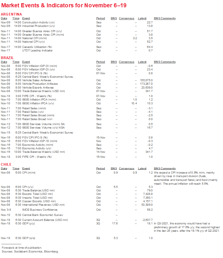 In the fortnight ahead, on Monday November 8, the INE will release October’s CPI. In addition, on Thursday, November 18, the BCCh will publish the GDP growth for the third quarter of 2021.