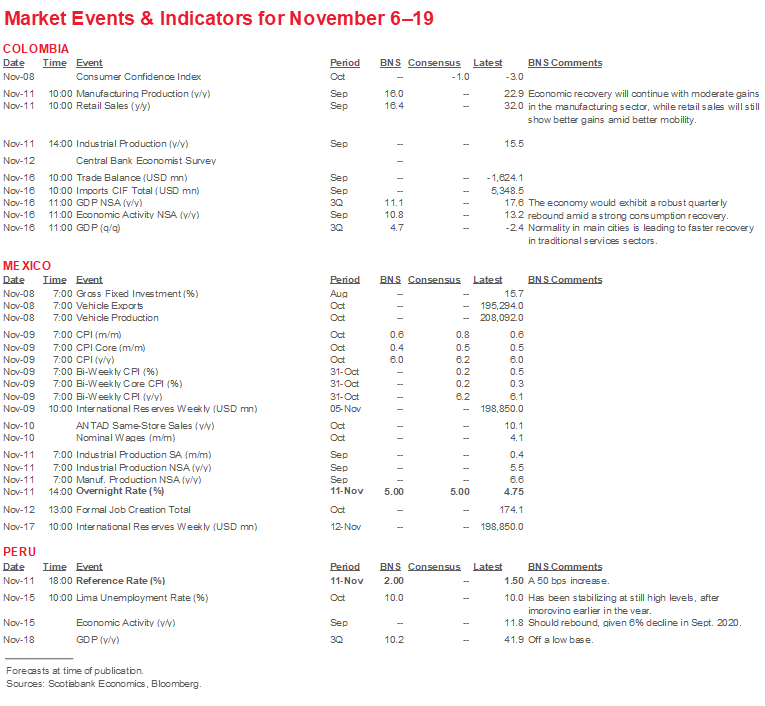 - A comprehensive risk calendar with selected highlights for the period November 6–19 across the Pacific Alliance countries, plus their regional neighbours Argentina and Brazil.