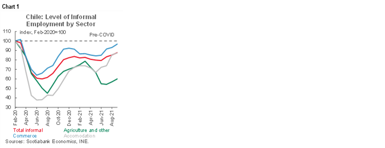 Regarding the labour market, on Friday October 29, the INE released the unemployment rate for the quarter that ended in September, which fell to 8.4%. The decline is explained by the higher growth in employment (1.0% m/m) compared to that of the labour force (0.9% m/m). We observe that the people are continuing to seek employment in a context of high labour demand. With this, the economy has recovered almost 1.3 million jobs compared to the 2 million that were lost as a result of the pandemic. In other words, the gap has now narrowed to 718 thousand jobs still to be recovered, of which 395,000 correspond to formal jobs. Currently, the government is subsidizing the hiring of formal employees, and the goal is the creation of 500,000 new formal positions between August and December, when the program will end. In contrast, the informal employment gap compared to pre-pandemic levels has decreased to 323,000 jobs, of which 118,000 corresponds to agriculture, livestock, forestry and fishing sectors, which could be associated with seasonality factors. In some sectors more associated with the reopening process, like commerce or accommodation services, the gap is around 20,000 jobs in each (chart 1).