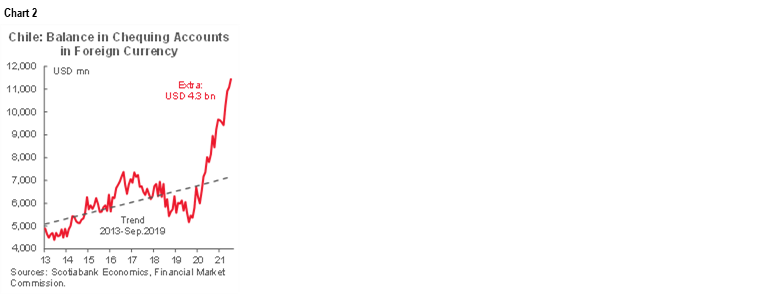 On Wednesday, November 3, the BCCh presented its quarterly Financial Stability Report. The central bank noted a significant negative impact on asset prices stemming from the deterioration of public finances, increased uncertainty and pension fund withdrawals, which have been reflected in falls in stock values, depreciation of the CLP and an increase in long-term interest rates beyond what is observed in international markets. One consequence could be a deterioration of financial conditions in the real estate sector, where mortgage loan rates have increased, as well as the terms and financial requirements for households to acquire a property. According to the Report, new withdrawals from pension funds are the main risk for financial stability. Also, the central bank reports a greater preference for assets in dollars by non-financial companies and households. There is increased purchases of USD by fund managers and companies, as well as an increase in the balances of chequing accounts denominated in USD (chart 2), reflecting an incipient dollarization.