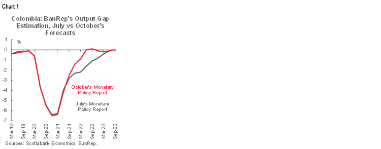 There are several challenges to this assessment. First of all, economic activity recovery in Colombia has been hard to follow owing to the nationwide strike in the first half of 2021. The strike not only stopped the recovery in Q1-2021, but also created uncertainty with respect to the political environment, which is unusual for Colombia after a long succession of pro-market governments. In addition, Q2-2021 coincided with the worst wave of COVID-19, which led the central bank to adopt a cautious stance and delay the start of the hiking cycle, given that inflation remained comfortably within the target range. However, after the nationwide strike effects ended in June and the government took an aggressive approach to reopening the economy, economic activity rebounded and in two months recovered what was lost in Q2. In fact, the BanRep’s staff projections for August GDP went from 7.5% in July to 9.8% in October. However, price pressures are a growing source of concern, as core inflation is now expected to surpass 3% next year. In fact, with the unusual volatility of economic activity projections and inflation that has accelerated sharply, BanRep’s staff has changed tack, going from a very gradual hiking cycle to a more aggressive approach. According to the most recent staff forecast, this abrupt shift implies that the neutral rate will be achieved earlier than expected, since negative output gap now is expected to close by June 2022 (only four months ago the output gap was anticipated to close by 2024) (chart 1), while end-2021 inflation is projected to be close to 5%, with end-2022 inflation at 3.6%.