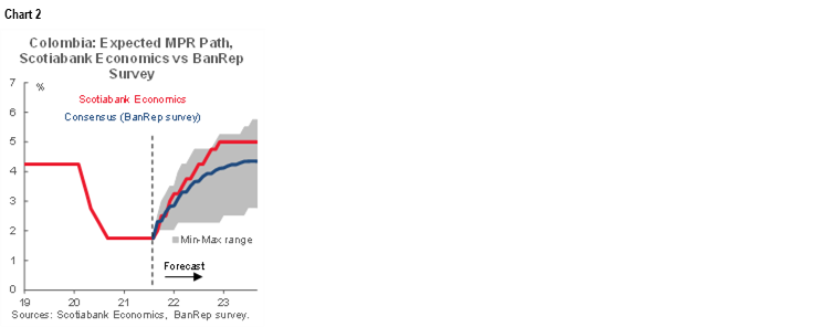 Meanwhile, in recent communications, the most hawkish members of the Board (Steiner and Villamizar) stressed that it is preferable to start the hiking cycle with a more aggressive approach to anchor inflation expectations and ensure that the terminal rate is close to the base case scenario. And since the latest outlook entails a healthier economy with temporary but longer-lasting inflation pressures, in our view, the hawkish perspective underlies the new base case scenario. In this regard, after a gradual hiking cycle started in September (+25 bps), the Board has decided to accelerate its rate hikes and in October increased the policy rate by 50 bps to 2.5% which should be followed by a further 50 bps hike in the December 17 meeting to end 2021 at 3%. For 2022, we think BanRep’s base case scenario is to achieve a neutral rate of 5% by year-end in a 25 bps path approach (chart 2); having anchored inflation expectations by a front-end loaded approach, headline inflation will start to go down and enter the target range by July 2022.