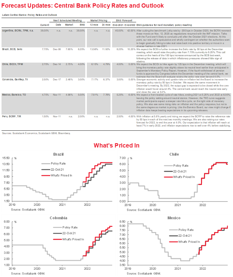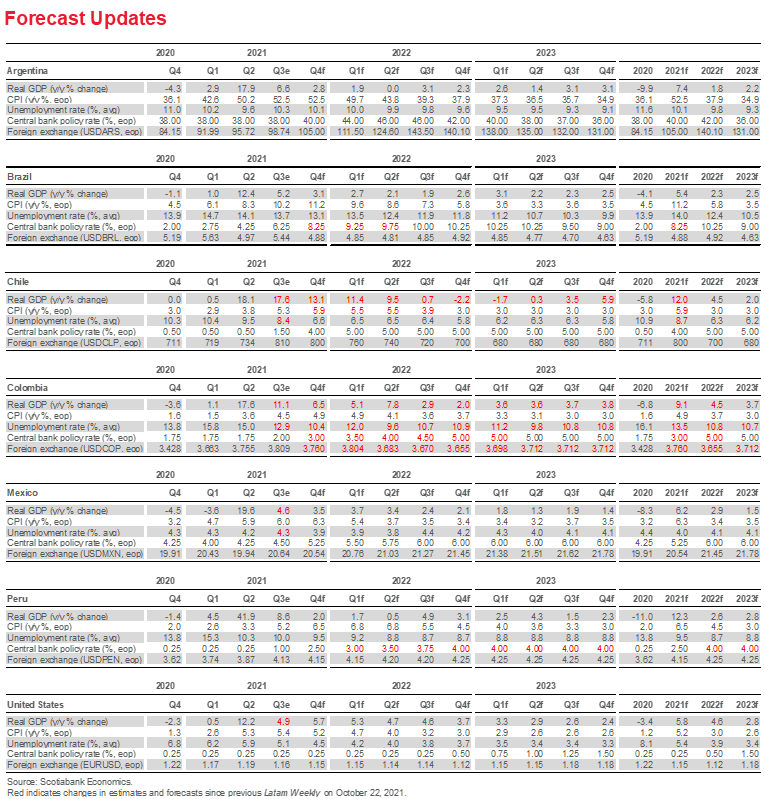 - Higher inflation and stronger growth numbers have led our analysts to revise key forecasts. Additional tightening is now expected in Brazil, Colombia and Peru. See the table below for the full set of revisions.