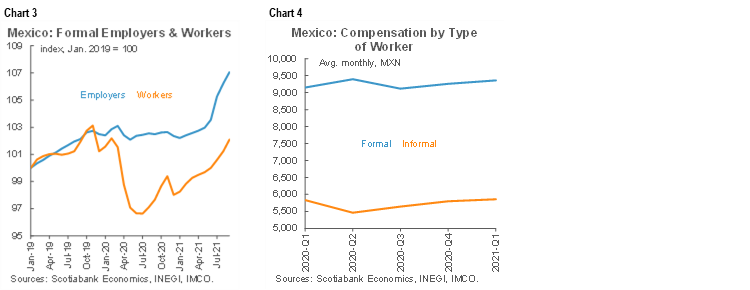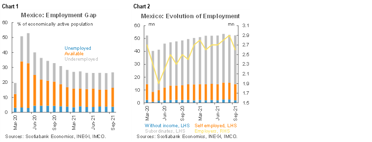 The Mexican labour market suffered a severe shock at the start of the pandemic, with the labour gap (the sum of unemployment, underemployment, and those available to work) more than doubling as a share of the economically active population in April 2020 (chart 1). The reopening of the manufacturing sector in June of that same year helped recoup about half of those losses, but since then the recovery has lost some steam. While we think there are several factors behind the slow labour market recovery, in our view, weak investment is the main culprit (investment as a share of GDP has fallen about 15-20% over the past 3 years). Rising costs have also affected the recovery, with the outsourcing bill, which limits the use of outsourcing and raising production costs, being the latest shock to hit the economy in August-September 2021, with a sharp decline in the number of employers (chart 2) clearly evident in September (though part of the decline reflects methodological issues).