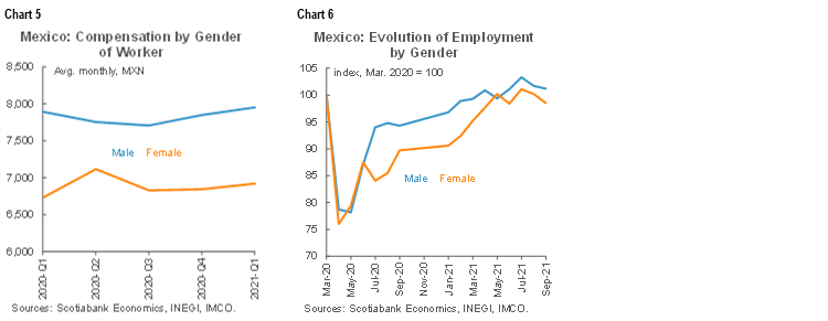 One of the most concerning elements of the Mexican labour market’s recovery has been the lag in the recovery of female employment, both in terms of jobs and income. There has been a clear divergence in wages by gender (chart 5)—a trend that is also being observed in other parts of the world. In terms of jobs, meanwhile, the initial hit taken by male and female employment at the start of the crisis was similar in both strength and pace (chart 6). However, since the June-2020 reopening of the manufacturing sector, which led to the sharp recovery in the labour market, the gap between jobs recovery by gender, which shut in the early months of 2021, has shown a very sharp divergence and has once again widened.