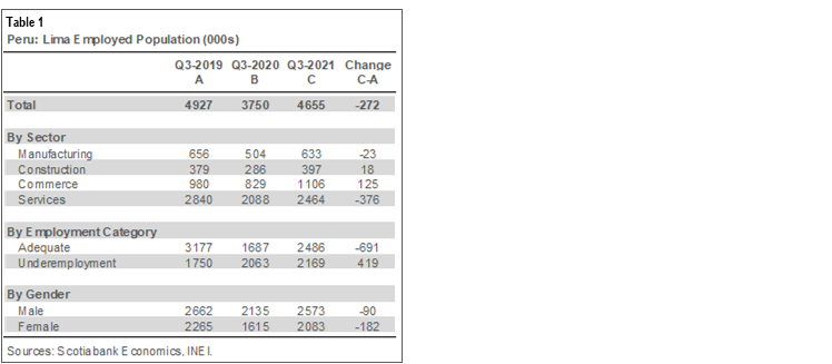 Employment in Lima has continued to recover in recent months (table 1) in the wake of the 2020 COVID-19 lock-down. The recovery has been broadly in line with the rebound in economic activity observed so far in 2021. However, the improvement in the job market has been uneven.