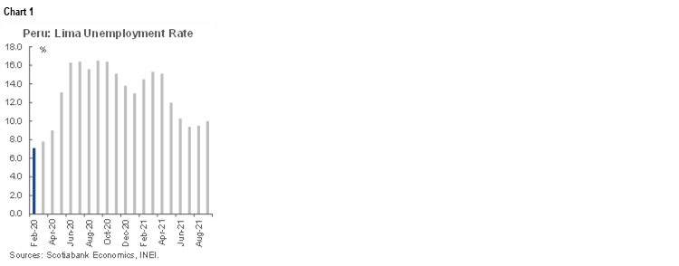 Job market prospects in 2022 are more uncertain. In part, this is because we expect political uncertainty to deter private investment—the main long-term driver of job growth. This could be offset, however, by progress made in the vaccination campaign. The government currently expects 70% of the target population to be vaccinated by Q1-2022. This would allow the restrictions associated with COVID-19 to be further relaxed, improving the outlook for a stronger recovery of service sector jobs. In addition, agro-industrial businesses have remained strong, and this could provide support for jobs growth outside of Lima. Finally, government-sponsored temporary employment programs to mitigate the impact of COVID-19 restrictions on jobs, including Trabaja Perú, are to continue into 2022. On balance, while unemployment should gradually improve, we expect unemployment to average 8.8% in 2022. While representing an improvement from current levels, this would remain above pre-COVID-19 levels of under 7%.
