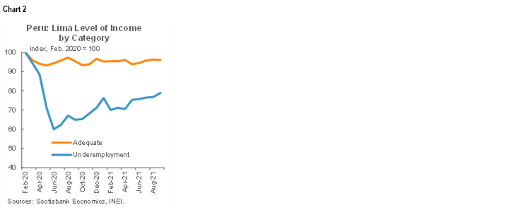 On the other hand, the unemployment rate in Lima stood at 10.0% in Q3-2021, well below the peak of 16.5% registered in Q3-2020 but higher than the 5.8% level recorded in Q3-2019 (chart 1). Unemployment figures must be interpreted with care, however, as informal employment represents around 78% of total jobs and the unemployment rate is thus not a good indicator of the strength of the labour market. The focus, rather, should be on the evolution of under-employment.